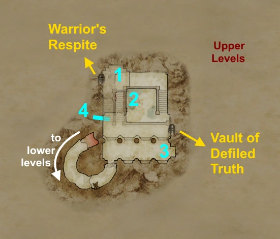 The Gutter of Misery comprises a stairwell area, the entrance to The Warriors' Respite, and a second area that resembles a winding sewer. At the end of the winding sewer is a door leading to the Shrine of Futile Truths.