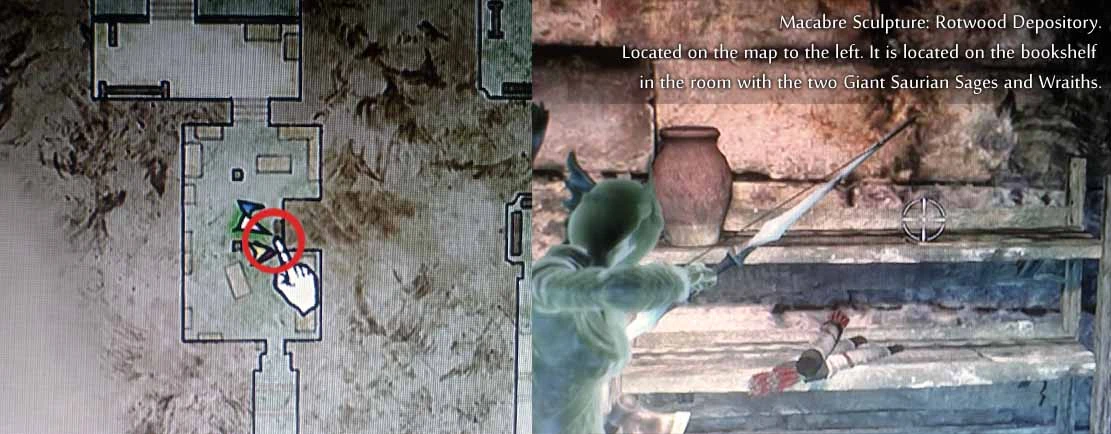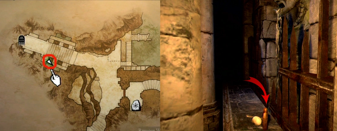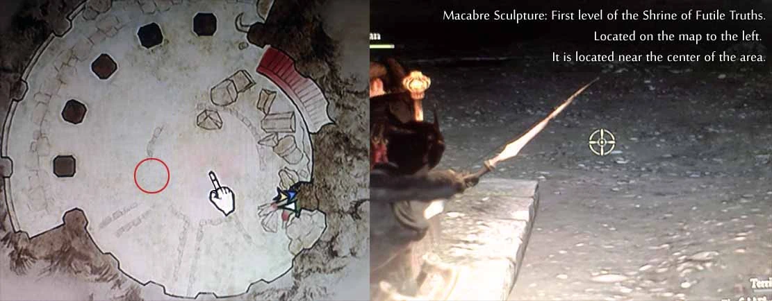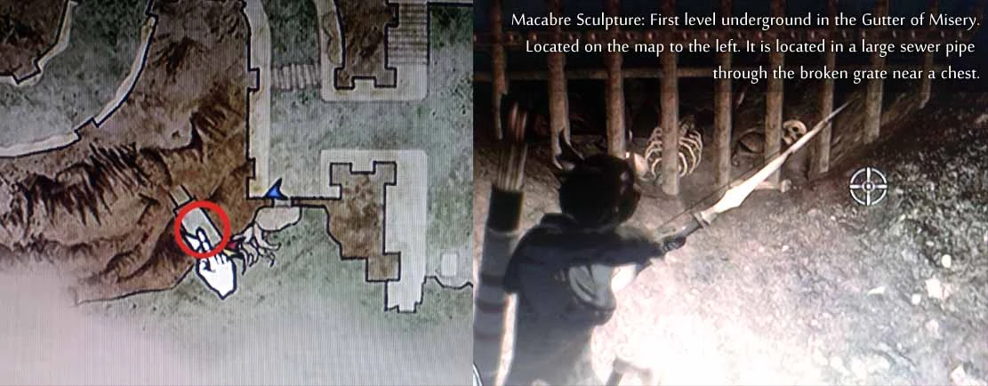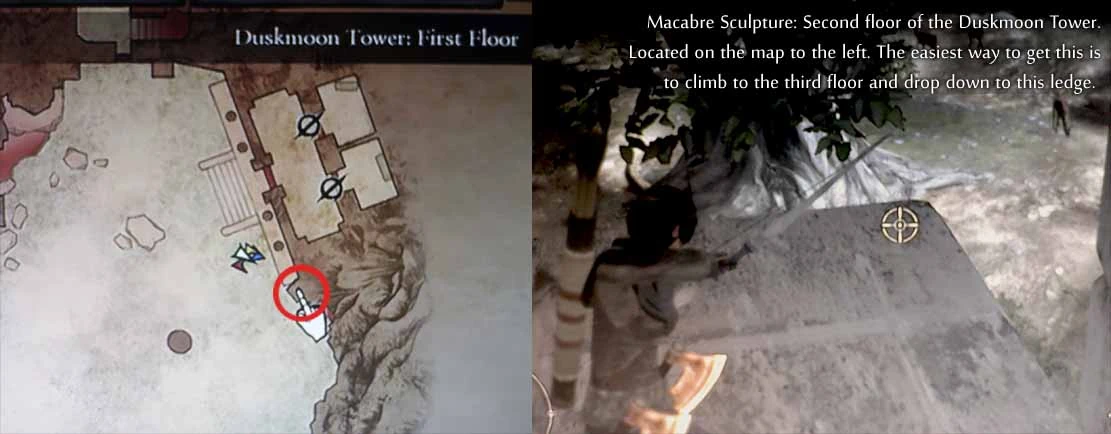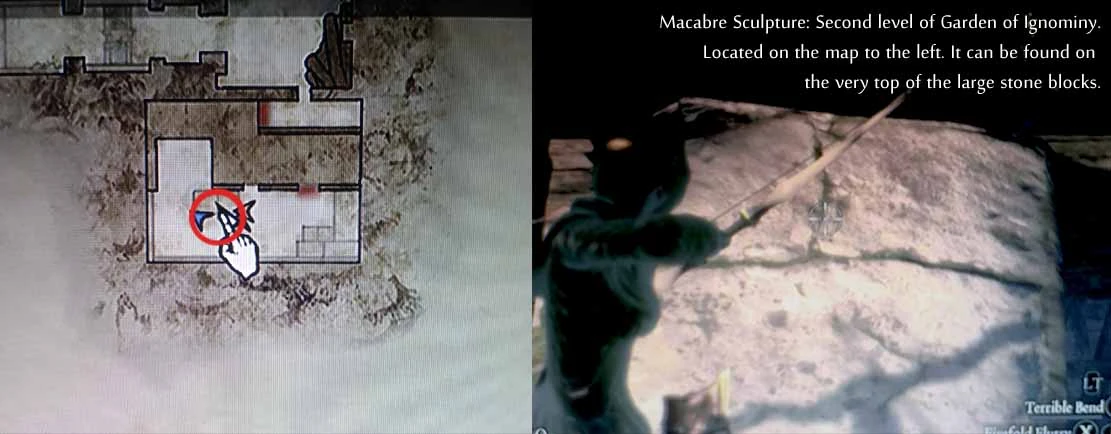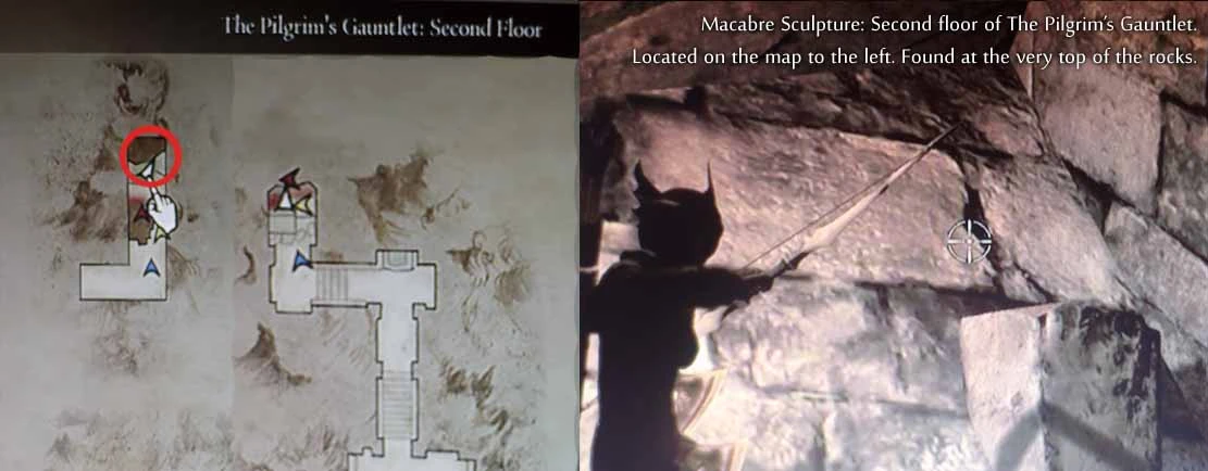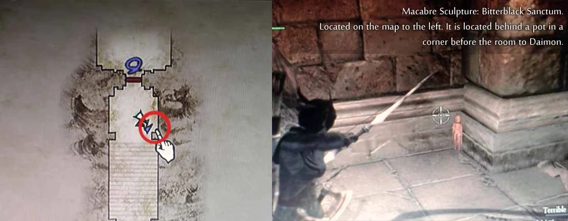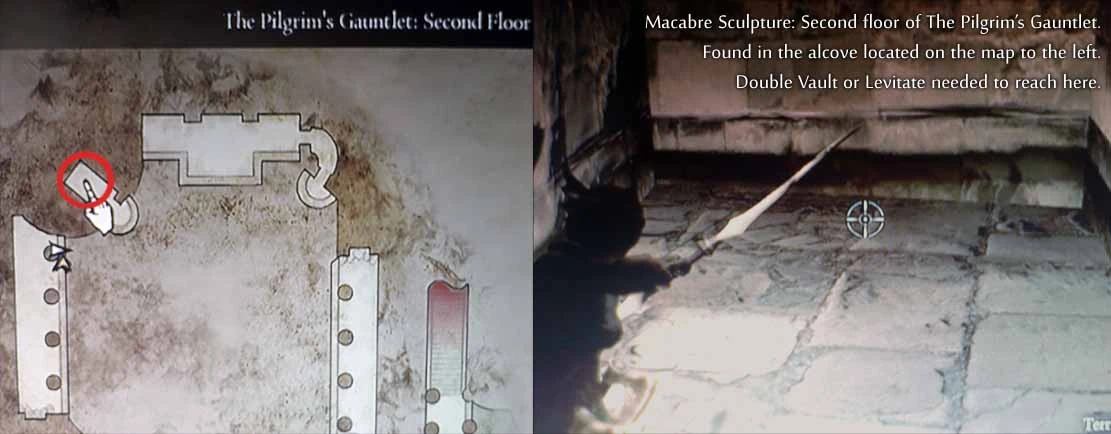 (First playthrough): On an upper ledge of the square tower - grab a succubus to get lifted up. This is easiest done by staying inside the square tower and waiting for a succubus attack. The succubus should be grabbed inside the square tower. It, then, is very easy to steer going up. There is also a Bitterblack Gear Lv.2 on the same ledge as the sculpture.