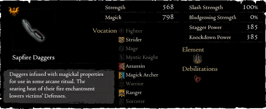 - These daggers are the only weapons capable of inflicting Lowered Defense. The debilitating power increases as the daggers are enhanced.