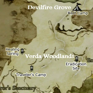 There are two routes from the more populous regions of Gransys to the Verda Woodlands - west from Manamia Trail via a bandit infested mountain path and the Vestad Hills leading to the eastern edge of the Woodlands; or via The Ancient Quarry through the southern fringe of Devilfire Grove.