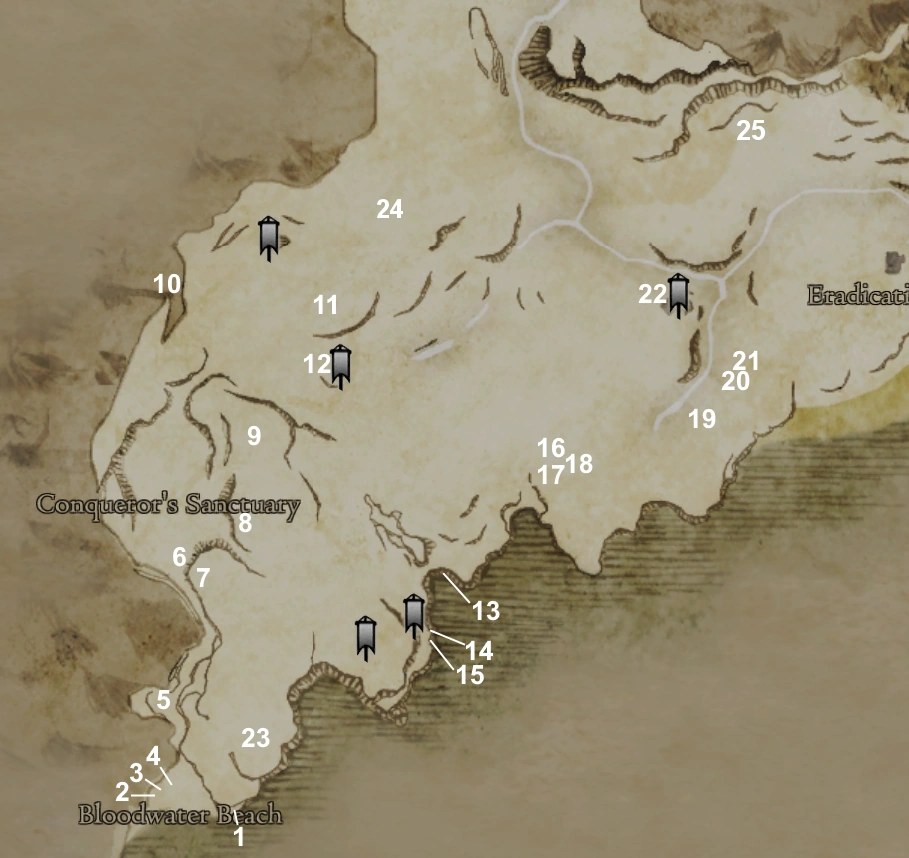 Bloodwater Beach is accessed via a narrow gorge leading down from the Conqueror's Sanctuary, along the path is a small unnamed cave and ledge in a small opening in the gorge - see Noonflower Cliff Cave.